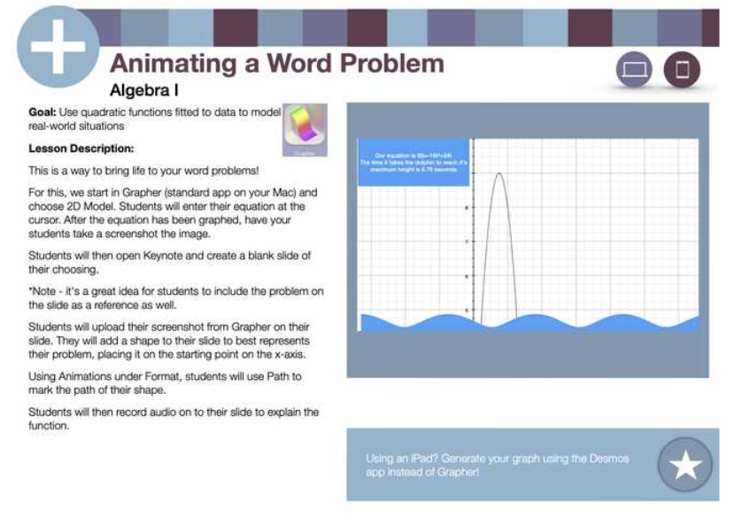 You can search topics like “High School Math” and find integration ideas like Animating a Word Problem. This is where a fellow educator has shared what they have done in their classroom with connecting math, creativity, and Apple technology.